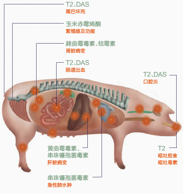 T-2毒素對(duì)豬禽的危害:T-2毒素由念珠球菌屬產(chǎn)生,直接損傷皮膚和粘膜。豬主要表現(xiàn)為厭食、嘔吐、生長停滯、瘦弱、皮膚及粘膜壞死、胃腸機(jī)能紊亂、繁殖和神經(jīng)機(jī)能障礙,免疫機(jī)能降低。對(duì)家禽造成的影響:產(chǎn)蛋率降低,羽毛生長不良,口腔潰瘍,采食量下降、拒食,神經(jīng)失調(diào),抑制免疫力。
